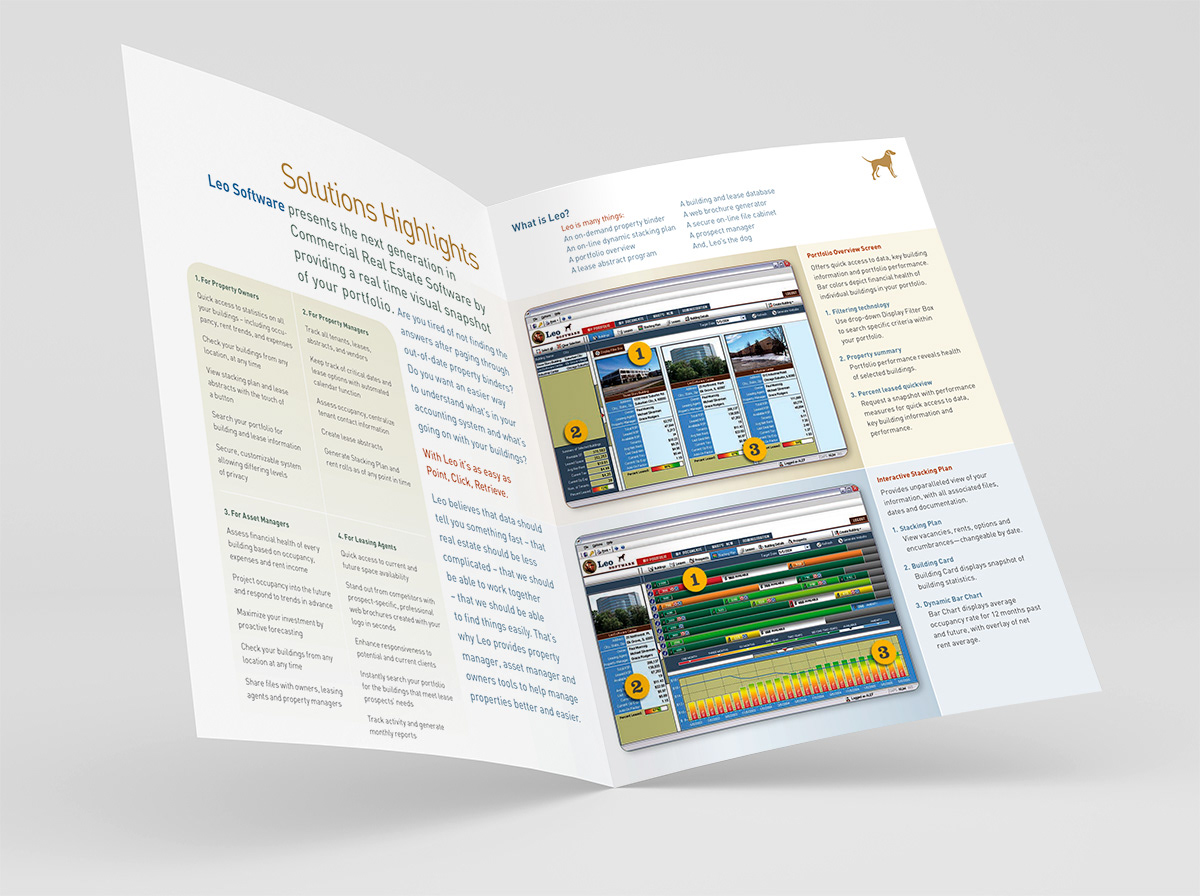 Leo Software brochure. Leo brings business intelligence to commercial real estate software. Leo simplifies the analysis, visual presentation and sharing of information needed for making decisions about commercial real estate.