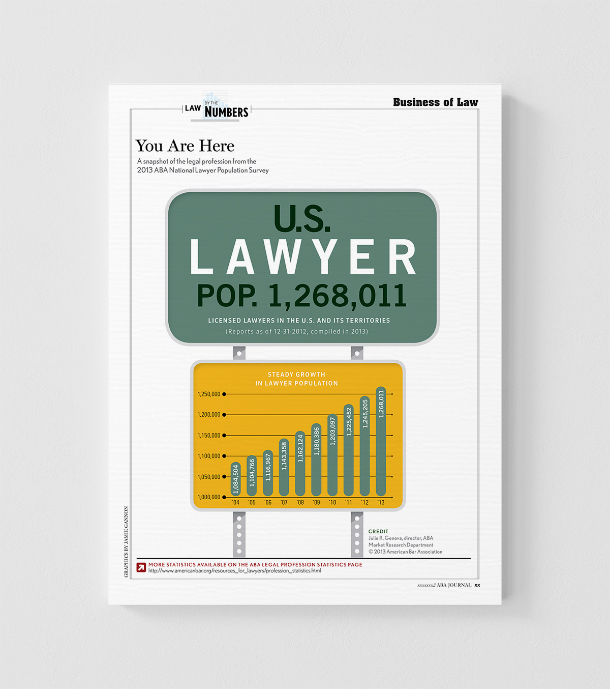 Law by the Numbers is an ongoing monthly department within the American Bar Association's widely circulated ABA Journal Magazine. A significant “number” relative to the legal profession is examined and highlighted graphically to provide a deeper insight into the trends of interest to readers of the magazine.